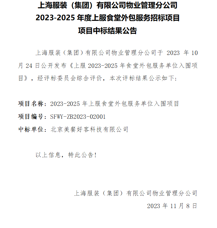 上海服裝(集團)有限公司物業(yè)管理分公司 2023-2025年度上服食堂外包服務(wù)招標項目項目中標結(jié)果公告